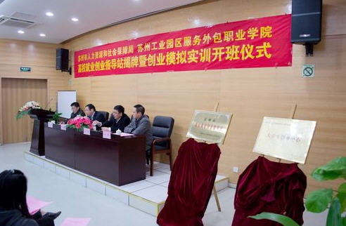 2011年12月9日,蘇州工業(yè)園區(qū)服務(wù)外包學(xué)院大學(xué)生創(chuàng)業(yè)中心高校就業(yè)創(chuàng)業(yè)指導(dǎo)站成立儀式暨首屆創(chuàng)業(yè)模擬實(shí)訓(xùn)班開班典禮在蘇州工業(yè)園區(qū)服務(wù)外包學(xué)院大學(xué)生創(chuàng)業(yè)中心舉行。蘇州市勞動(dòng)就業(yè)管理服務(wù)中心主任洪偉芳、學(xué)院院長(zhǎng)楊冬,學(xué)工處處長(zhǎng)趙強(qiáng)、各系2009級(jí)輔導(dǎo)員及首期創(chuàng)業(yè)培訓(xùn)班學(xué)員參加,蘇州市大中專畢業(yè)生就業(yè)指導(dǎo)中心主任劉衛(wèi)國主持儀式,該校是蘇州市第十二所建站學(xué)校。