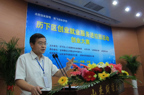 為進(jìn)一步引導(dǎo)大學(xué)生轉(zhuǎn)變就業(yè)觀念,提高大學(xué)生創(chuàng)業(yè)能力,促進(jìn)高校畢業(yè)生成功就業(yè)創(chuàng)業(yè),2012年6月21日,由濟(jì)南市歷下區(qū)人力資源和社會(huì)保障局主辦,全球模擬公司聯(lián)合體中國(guó)中心承辦的歷下區(qū)創(chuàng)業(yè)就業(yè)服務(wù)進(jìn)校園活動(dòng)創(chuàng)業(yè)大賽活動(dòng)在山東財(cái)經(jīng)大學(xué)舉辦。本屆大賽以"點(diǎn)燃創(chuàng)業(yè)激情、放飛創(chuàng)業(yè)夢(mèng)想"為主題,出席大賽的領(lǐng)導(dǎo)有山東省人力資源和社會(huì)保障廳副廳長(zhǎng)李伯平,山東省財(cái)經(jīng)大學(xué)副校長(zhǎng)胡文波,山東省勞動(dòng)就業(yè)辦公室主任畢京福,濟(jì)南市人力資源和社會(huì)保障局局長(zhǎng)蔣曉光,歷下區(qū)人民政府副區(qū)長(zhǎng)劉科,歷下區(qū)人力資源和社會(huì)保障局局長(zhǎng)吳明等領(lǐng)導(dǎo)。全球模擬公司聯(lián)合體中國(guó)中心主任、正保遠(yuǎn)程教育集團(tuán)副總裁孫洪峰應(yīng)邀出席了本屆大賽。