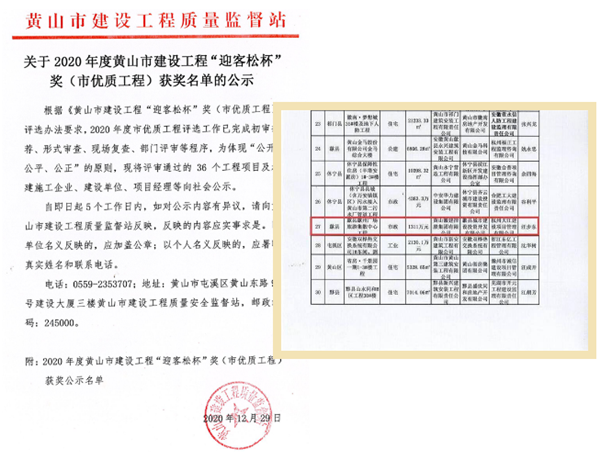 歙縣歙州廣場旅游集散中心工程”榮獲2020年度黃山市“迎客松杯”獎(市優(yōu)質(zhì)工程)