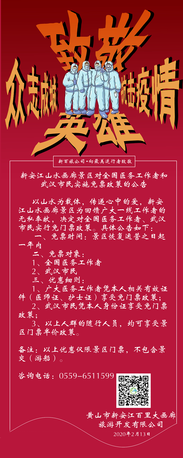 為了表達(dá)對(duì)廣大醫(yī)務(wù)工作者的感謝,新安江山水畫廊景區(qū)承諾:全國醫(yī)務(wù)工作者及武漢市民全年門票免費(fèi),導(dǎo)游陪伴!