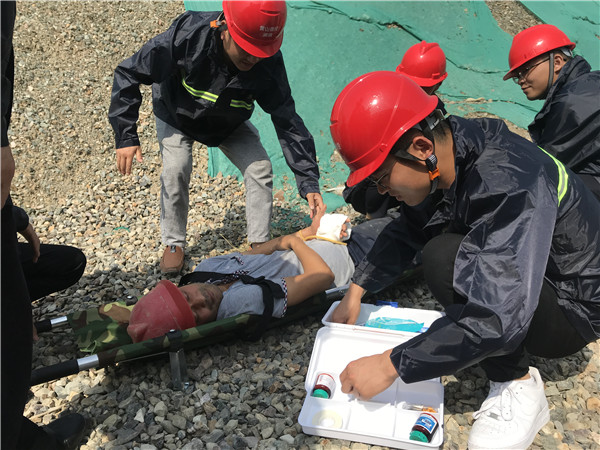本場演練模擬了開發(fā)區(qū)砂石場內(nèi)因大雨導致堆料場一側(cè)發(fā)生坍塌,造成其中一名職工被部分掩埋。對此,鴻瑞公司應(yīng)急救援指揮部在接到報告后立即組織各應(yīng)急救援小組開展救援工作,不僅成功救出被掩埋職工,更是第一時間將其送往縣醫(yī)院醫(yī)治。