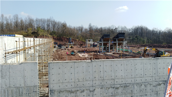 截止12月底已完成砂石加工顎破、圓錐破、沖擊破、振動(dòng)篩等主設(shè)備的安裝,土石方8000立方米,廠房樁基62根,總樁長(zhǎng)624米;澆筑混凝土500立方米;7米高擋墻230米,澆筑混凝土1300立方米;2米高擋墻100米,澆筑混凝土400立方米。當(dāng)前施工單位正在架立原料庫(kù)擋墻鋼筋和安裝砂石加工設(shè)備附件,力爭(zhēng)于2021年1月30日前完成生產(chǎn)區(qū)設(shè)備附件安裝和原料區(qū)基礎(chǔ)澆筑任務(wù)。