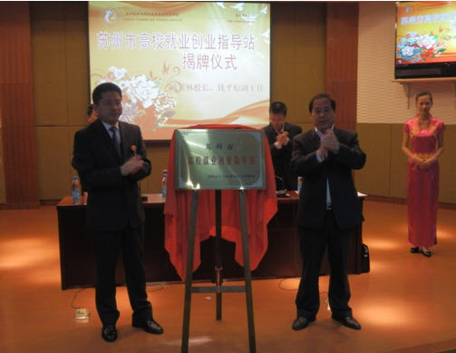 臧其林校長(zhǎng)與錢平原主任為蘇州旅游與財(cái)經(jīng)高等職業(yè)技術(shù)學(xué)校,高校就業(yè)創(chuàng)業(yè)指導(dǎo)站揭牌