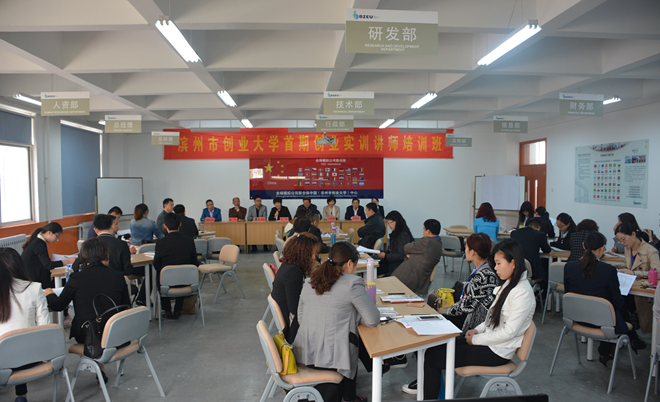 為進一步強化濱州市創(chuàng)業(yè)培訓(xùn)師資隊伍建設(shè),提高創(chuàng)業(yè)培訓(xùn)專業(yè)化水平,濱州市創(chuàng)業(yè)大學(xué)聯(lián)合金馬蘭創(chuàng)業(yè)服務(wù)平臺于2016年4月15日至4月21日在濱州市創(chuàng)業(yè)大學(xué)成功召開了首期創(chuàng)業(yè)實訓(xùn)講師培訓(xùn)班。本次師資班邀請全球模擬公司聯(lián)合體中國中心國家級培訓(xùn)師顏紅寶和李杰群老師授課,來自濱州市各大院校、培訓(xùn)機構(gòu)的40多位學(xué)員參加了此次培訓(xùn)班的學(xué)習(xí)并成功結(jié)業(yè)。濱州市勞動就業(yè)辦公室主任趙炳炎、副主任付風(fēng)霞,濱州市技術(shù)學(xué)院副院長朱莉,濱州市勞動就業(yè)辦公室指導(dǎo)科科長張登禮、金馬蘭創(chuàng)業(yè)服務(wù)平臺總經(jīng)理陳宗曉出席,朱莉院長致辭、趙炳炎主任做重要講話,對師資培訓(xùn)的學(xué)員提出要求。